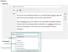 Een blok kun je een blokrol geven waarmee het een achtergrondkleur krijgt. Per subsite zijn 4 blokrolkleuren beschikbaar, en een inleiding.